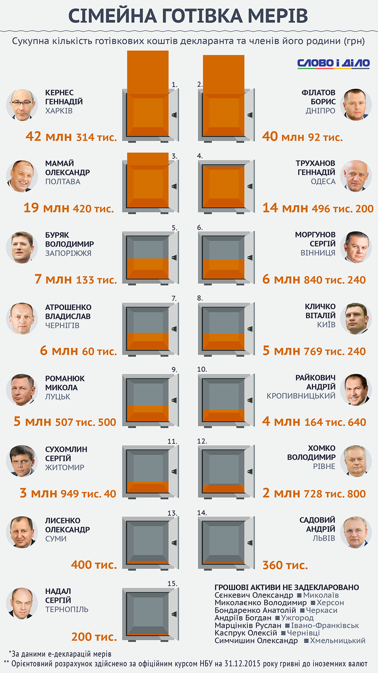 Остальные городские головы областных центров, очевидно, не слишком доверяет банковской системе. Ярким свидетельством этого являются наличные сбережения мэра Харькова Геннадия Кернеса, который хранит «под матрасом» сумму, эквивалентную 42,3 млн грн. Ему на пятки наступает Борис Филатов из Днепра, который с семьей владеет почти 40,1 млн грн наличности в пересчете по курсу на 31 декабря 2015 года. Третьим с большим отставанием идет мэр Полтавы Александр Мамай, у которого наличными хранятся 19,4 млн грн.