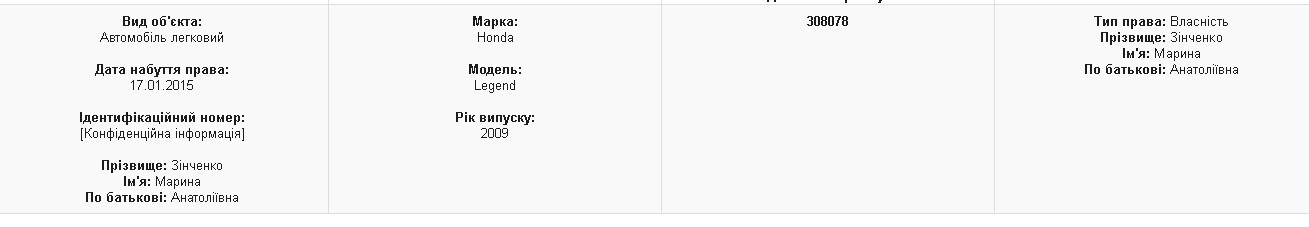 В 2015 году на посту директора департамента чиновник получила около 132 тыс. гривен. В январе прошлого года она приобретает право на Honda Legend (2009) стоимостью 308 тыс. гривен.