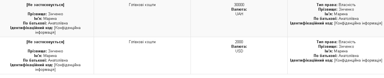 Ранее редакция 368.media зафиксировала, что Марина Зинченко предоставила две разных декларации за 2014 год. Первая была опубликована на сайте ОГА еще весной прошлого года. В документе указывалось, что Марина Зинченко получила в наследство 2,27 млн гривен. В декларации за этот же период, которую она предоставила летом того же года в рамках закона «Об очищении власти», указано, что в наследство она получила 655,4 тыс. гривен. Таким образом, разница между показателями составила 3,4 раза! Кроме того, в новой декларации был указан некий неизвестные автомобиль 2009 года выпуска.