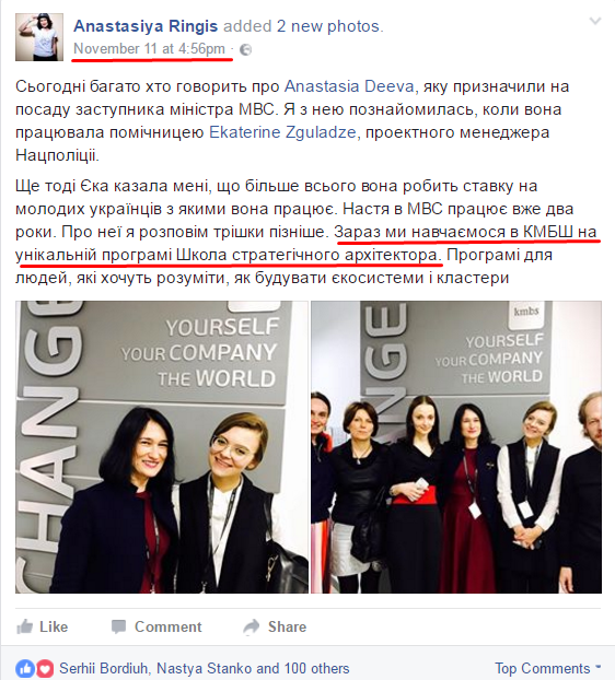 Заангажированность Рингис абсолютно неприкрытая - еще на прошлой неделе, в пятницу, когда скандал с Анастасией Деевой только набирал обороты, журналист опубликовала пост о том, что вместе с Анастасией Деевой они обучаются в КМБШ.