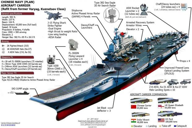 Водоизмещение китайского авианосца «Ляонин» составляет 59,5 тысячи тонн при длине 304 и ширине 75 метров. Корабль может развивать скорость до 29 узлов, а дальность его хода составляет около восьми тысяч миль. «Ляонин» вооружен тремя зенитными артиллерийскими установками Type 1130 калибра 30 миллиметров, тремя пусковыми установками зенитных ракет FL-3000N и двумя установками противолодочного вооружения.