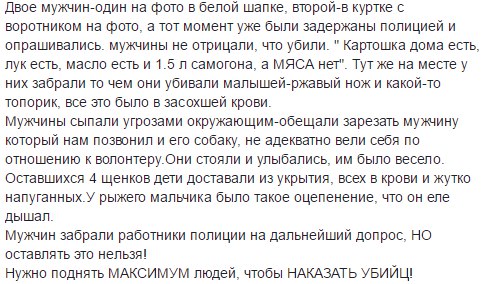 "Малыши задыхались и захлебывались своей кровью, перед тем как умереть. Запах крови был повсюду, вокруг все та же картонная коробка, но уже вся в крови... четвертый малыш залез в укрытие, но перерезанное горло не оставило ему шансов. В луже крови, он так и умер, а рядом с ним в испуге сидели оставшиеся 4 щенка, которым повезло выжить", – отмечают активисты.
