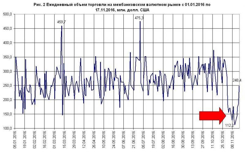 Фактически это означает, что продавцы валюты (экспортеры) придерживали доллары и евро, возможно, в ожидании очередного этапа девальвации. Выборный сюрприз из США лишь стал сигналом для начала ралли на межбанке. А вот в чем причина такого поведения, можно только догадываться - то ли они просто выжидали сезонную девальвацию, то ли решили не торопиться со сделками, ожидая итогов выборов в США. Так или иначе, объемы восстановились только 17 ноября, однако на $30 млн ниже среднедневного показателя.