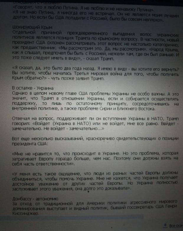 - Дроны, значит ушли, НАТО отступило. Уже Киев в шоке, что он без НАТО остался. И Трамп такой, Порошенко и говорит, не дам тебе Россию на колени поставить. И денег не дам. Вот! И Порошенко испугался. А еще ж Трамп, это ставленник Януковича по версии Порошенко. Вот тут вообще все не поняли. Это хорошо или плохо. Бо тут же уже все хотят Януковича взад, при нем же войны не было и доллар по восемь. А если он ставленник Порошенко, тьху ты, Януковича, но по версии Порошенко, то хто ж тогда будет Президентом Украины и Америки,-Трамп, Янукович и доллар по-восемь, Порошенко или Путин. Все запутались. А лектор был не готов. Распутывать.