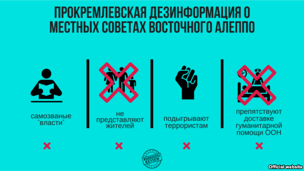 Так, например, «ТАСС» сообщает, что местные советы в восточной части Алеппо являются «самозванной властью» и далеки от того, чтобы представлять жителей»; что они «всячески подыгрывают террористам»; и что «обструкционистская позиция «советов» привела к отмене гуманитарной операции ООН по доставке помощи». Представление местных советов как органов, связанных с террористами, по мнению экспертов, является примером использования одного из главных методов прокремлевской дезинформации. Он состоит в том, чтобы называть террористическими те группы, которые не вписываются в прокремлевский нарратив.