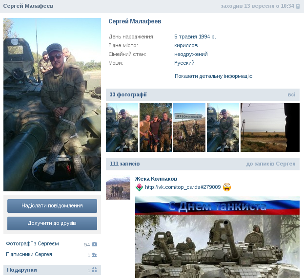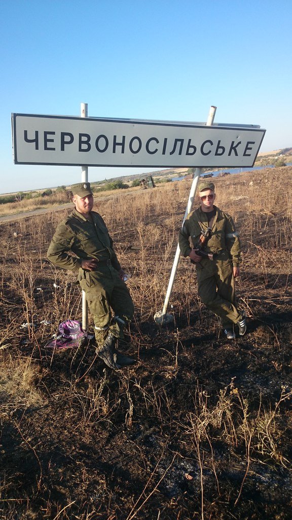 Дмитриев проходил срочную службу в 522-м гвардейском рижском учебно-танковом полку, а летом стал контактником. Похожую фотографию на фоне Червоносільське запостил 20-летний Сергей Малафеев из Никольского Торжка: