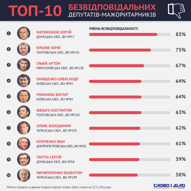 Самыми безответственными народными избранниками являются нардеп от "Оппозиционного блока" Сергей Матвиенков, представитель БПП Юрий Бублик и член депутатской группы "Відродження" Артем Ильюк.
