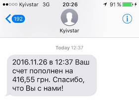 Именно в такую ситуацию попала и я. О краже (да, я дальше буду называть данный инцидент именно кражей) я узнала совершенно случайно - получив на свой номер Киевстар смс-сообщение  о том, что мой счет внезапно пополнен на 416,55 грн.