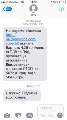Я попросила выслать мне несколько адресов таких сайтов, в том числе сайта, который был указан в СМС-сообщении с информированием о включении подписки стоимостью 4,25 грн в день ( ua.tremgrope). Найти сообщение о включении подписки за 2,13 грн в месяц мне не удалось, но, думаю, это уже не столь важно - списания начались в один и тот же месяц (июль 2016) и это наверняка была аналогичная махинация. Вот эти адреса: