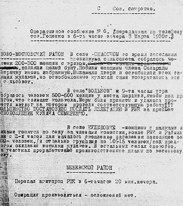 «В трьох округах: в Тульчинському, Шепетівському і Могилівському справжнє повстання селян. Повстання придушене збройною силою, пустивши в хід кулемети, а в деяких місцях гармати. Убитих і розстріляних 100, поранених кілька сотень... У інших районах (Коростенському, Вінницькому, Криворізькому, Харківському, Мелітопольському) такі ж бунти», — написав наприкінці березня 1930 року спеціально відряджений в Україну сталінський ревізор, нарком Робітничо-селянської інспекції СРСР Григорій Орджонікідзе.