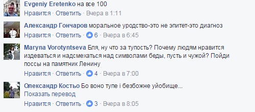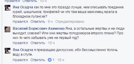 Яна Осадча нагадала автору поста про те, що навіть в тих регіонах України, які не постраждали під час Голодомору 1932-33 років, проводилися жалобні заходи, і люди ставили запалені свічки на підвіконня. У той же час деякі жителі Луганської області, "де люди вмирали, з ранку жеруть курку і запитують, чи погано про це писати".