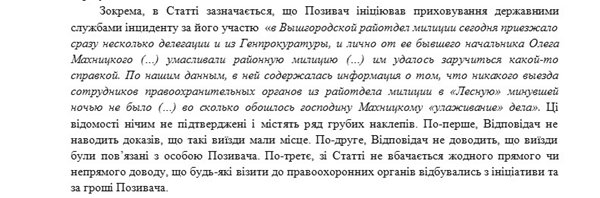 Не исключено, что подобная уверенность адвокатов Махницкого опирается на предварительно проведенную «работу» со свидетелями. По информации, полученной от сотрудников Вышгородского РОВД на условиях строжайшей анонимности, буквально сразу после появления в интернете публикации о похождениях Махницкого и Кубива райотдел посетил представитель прокуратуры. Он потребовал от руководства отдела не только выдать ему справку о том, что никакого выезда милиции в ночь на 19 июня и утром этого же дня в отельно-ресторанный комплекс «Лесная» не было, но и подготовить аналогичное сообщение для СМИ.