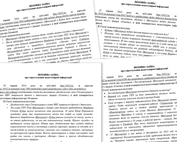 Как удалось выяснить, разбираться в судебном порядке Олег Махницкий решил комплексно, предъявив претензии сразу всем своим недругам. Так, кроме публикаций о его загородных приключениях («Дембельский» загул Генпрокурора и главы НБУ завершился дракой с девочками?» и «Махницкий и Кубив дали милиции денег, чтобы замять скандал с девочками?»), предметом разбирательств также стали журналистские материалы о коррупционных деяниях обоих фигурантов скандала («Кубива с Махницким ждет дальняя дорога или казенный дом?» и «Экс-генпрокурор Махницкий готовится сбежать за границу?»).