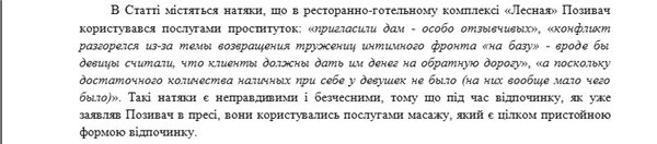 При этом адвокаты, не отрицая сам факт присутствия в коттедже специально приглашенных девушек, настаивают на том, что речь в данном случае шла не об оказании интимных услуг, а об оздоровительном массаже. В частности, в исковом заявлении указывается, что в публикациях «…содержатся намеки, что в ресторанно-гостиничном комплексе «Лесная» Истец пользовался услугами проституток: “пригласили дам - особо отзывчивых (опять же – в рамках прейскуранта)”, “конфликт разгорелся из-за темы возвращения тружениц интимного фронта «на базу»”, “а поскольку достаточного количества наличных при себе в девушек не было (на них вообще мало чего было)”. Такие намеки являются ложными и бесчестными, так как во время отдыха, как уже заявлял Истец в прессе, он пользовался услугами массажа, который является вполне приличной формой отдыха».
