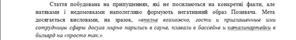 Примечательно, что прилично отдыхавший Махницкий обиделся даже на высказывания, вроде бы доказывавшие невинность его намерений: «вполне возможно, гости и приглашенные ими сотрудницы сферы досуга мирно парились в сауне, плавали в бассейне и катали партейки в бильярд на “просто так”.» Эти допущения трактуются его юристами как «намеки и недомолвки», которые снова-таки «настойчиво формируют негативный образ Истца».