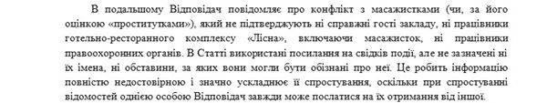 При этом сторона истца категорически отрицает факт драки: «…Ответчик, сообщает о конфликте с массажистками (или, по его оценке “проститутками”), который не подтверждают ни настоящие гости заведения, ни работники гостинично-ресторанного комплекса «Лесная», включая массажисток, ни работники правоохранительных органов. В Статье использованы ссылки на свидетелей происшествия, но не указаны ни их имена, ни обстоятельства, при которых они могли быть осведомлены о них».