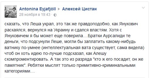 "Это бред, что Алексей мог украсть деньги. Полнейший и дикий бред. Кому он перешел дорогу? Донецкой мерзости нового пошиба? Думайте, вспоминайте: кому он мешал", - написала в Facebook уважаемаяНаталья Савинова - доктор юридических наук, зав. Центром информационно-правовых проблем национальной безопасности НИИ информатики и права Национальной академии правовых наук Украины. И добавила, что готова характеризовать личность в суде и даже выступить поручителем Цистана.