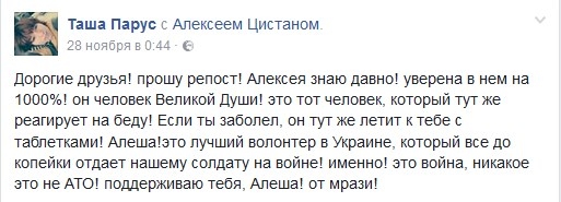 В защиту волонтера также написал известный фотографи блогерАлексей Заклецкий и рассказал о произошедшем (по версии Алексея Цистана - прим. ред.): "По словам Олексія конфлікт почався ще Краматорську, але потім вщух, а при під’їзді до станції Дарниця спалахнув знову в результаті чого двоє чоловіків Максим Аурсаліді та його брат його побили, підкинули гроші і тут же здали поліцейським".
