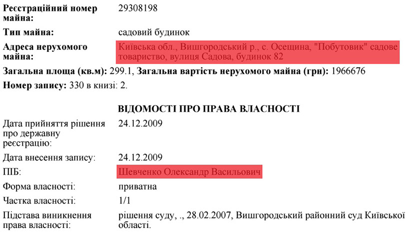 З 2004р. Олександр Васильович володіє земельною ділянкою площею 12 соток під Києвом на території садового товариства "Побутовик", а з 2007р. - і "садовим" будинком на 300м², який до того часу встиг на цій ділянці спорудити.