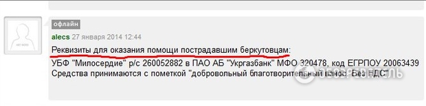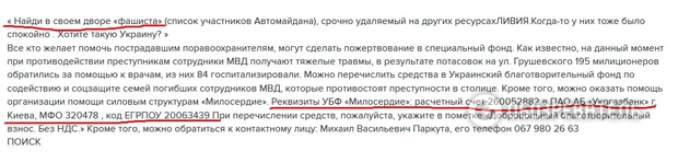 Как обнаружили читатели "Обозревателя", объявление с этими же реквизитами в 20-х числах января 2014 г. (во время столкновений на ул Грушевского в Киеве) были размещены и на сайте МВД Украины, и в многочисленных группах в соцсетях - в защиту "Беркута", "Россия - Моя Родина" и т.д.(см. скриншоты).