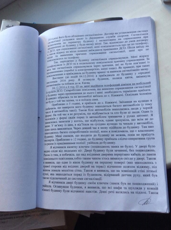 «4 декабря в 4:03 мне поступил телефонный звонок на мобильный с пульта ГСО, сотрудник сообщил, что обнаружено срабатывание сигнализации в доме через проникновение в него и мне необходимо срочно приехать», — говорится в показаниях.