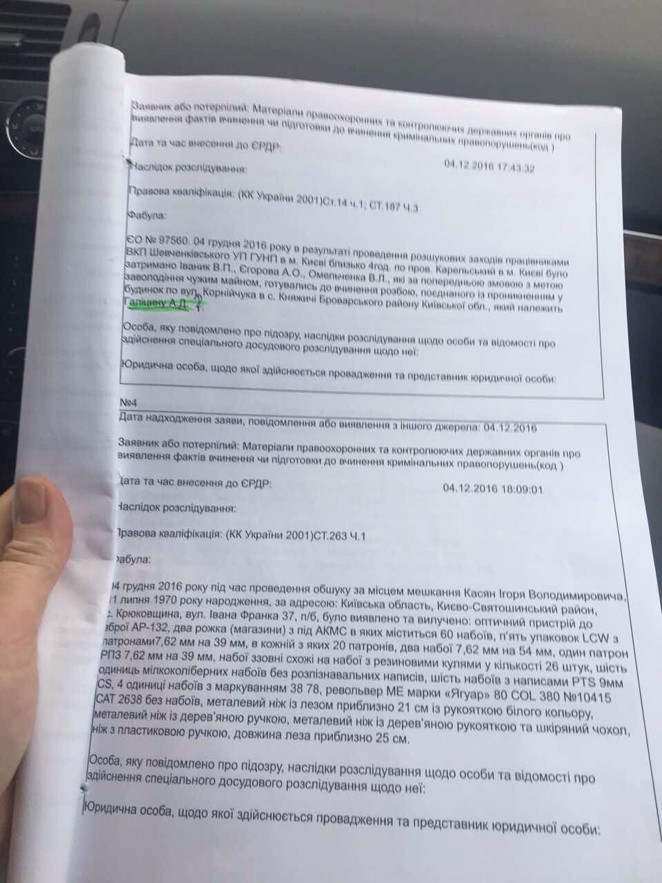 "Страна" также получила в свое распоряжение материалы судебного решения о задержании Виталия Омельченко. Из них следует, что помимо незаконного хранения оружия, полиция подозревает задержанных в подготовке ограбления дома в Княжичах по улице Корнийчука 22, который принадлежит гражданину Галицыну (мы о нем писали в нашем репортаже из Княжичей) и где живет гражданка Данишевская Т.Е. Это статья 187 УК "Разбой".