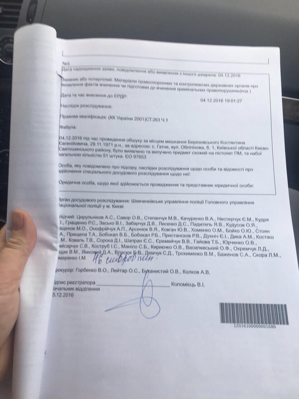 У Березовского обнаружен пистолет Макарова и 51 патрон. У Игоря Касьяна обнаружен оптический прицел АР–132, два магазина АКМС, револьвер Ягуар.