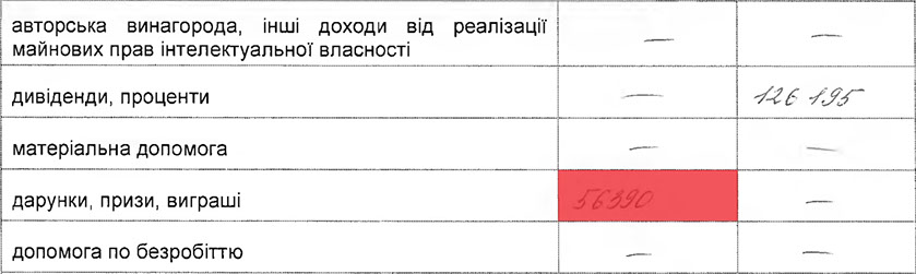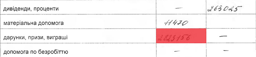 2млн.823тис.грн. їй вдалося якимось чином "виграти"(?), або їх просто "подарували"(?), так як саме ця сума зазначена в графі «дарунки, призи, виграші».