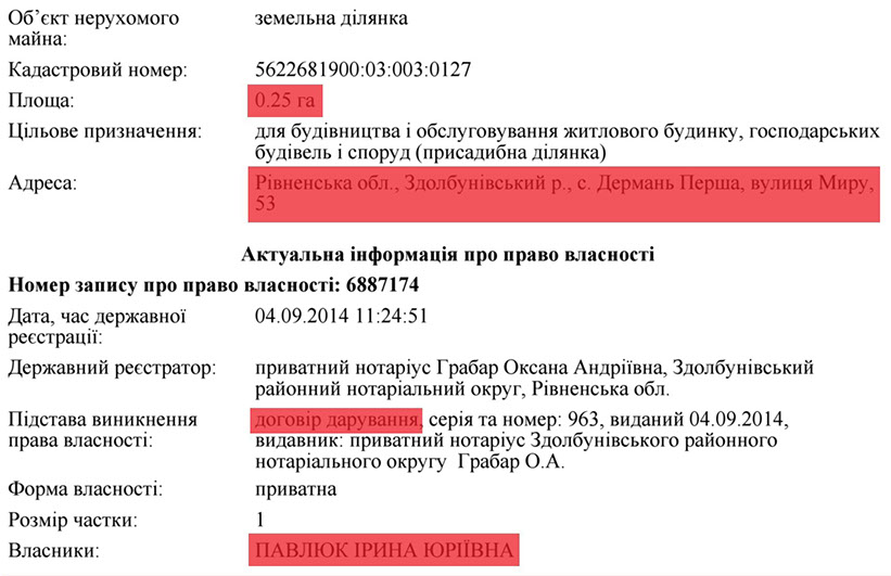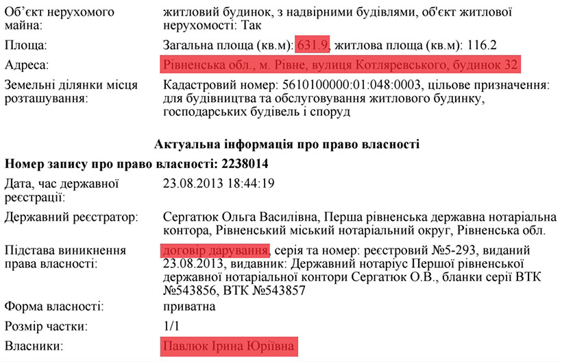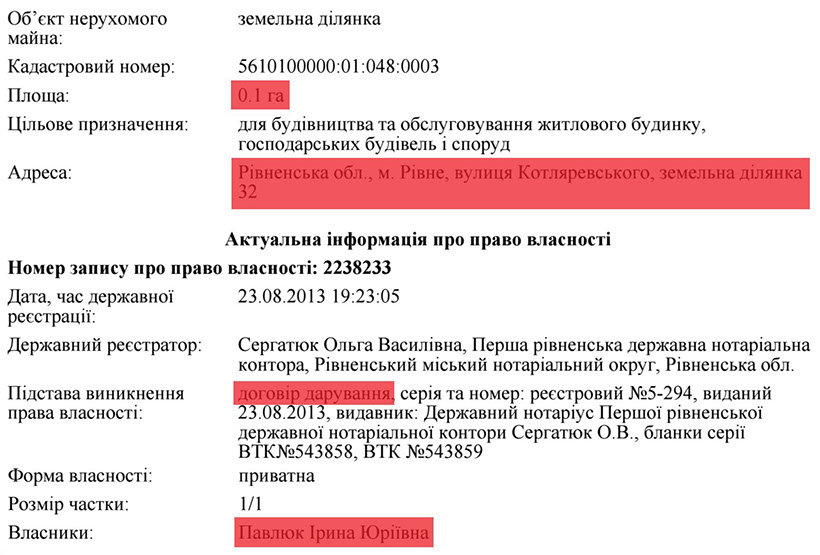 У цьому ж 2013 році судді Павлюк вдалося обжитися ще й землею та нерухомістю, а саме земельною ділянкою в 10 соток по вул. Котляревського в м.Рівне та будинком на 631,9м².