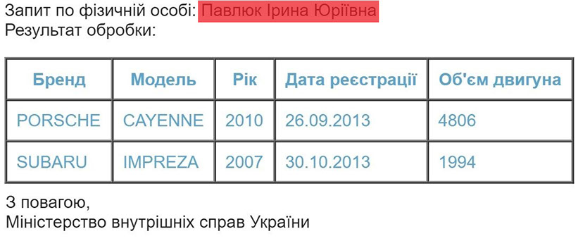 Окрім нерухомості, пані Павлюк обзавелася в щасливому для себе 2013-му також і двома потужними автомобілями.