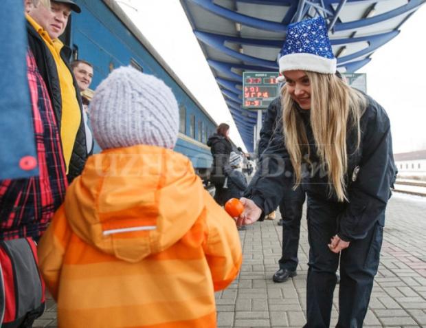 Згодом, перетворившись у "чарівників", на залізничних вокзалах Ужгорода і Мукачева поліцейські у святкових ковпаках, із цукерками та щирими посмішками зустрічали потяги і вітали гостей з Різдвом.