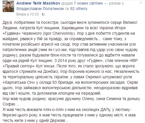 В ніч на 10 грудня помер волонтер і боєць "Правого сектора" Ігор Червонний з позивним "Гудвін" родом з міста Куп’янська Харківської області. Свої співчуття друзі і побратими бійця АТО висловлюють в Facebook.