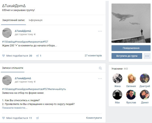 «Они приходят, когда тебе плохо. Не ищи модераторов — сами тебя найдут», — пишет мне 16-летняя девушка из Мариуполя. Неделю назад с одной из городских высоток спрыгнула ее подруга. По версии следствия, 15-летняя Вилена покончила с собой из-за онлайн-квеста.