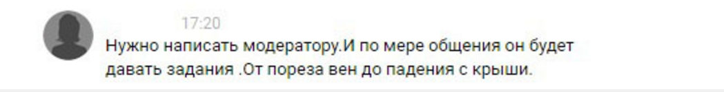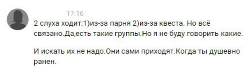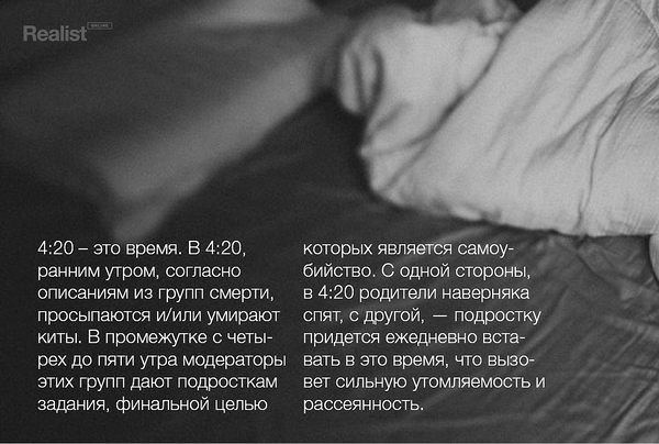 «Модераторы никогда не добавят в друзья кого-то неоднозначного. Чтобы тебя привлекли в игру, ты должен быть по-настоящему депрессивным. Первым заданием может быть подержать руку над свечой, а потом проколоть ожог, или вырезать что-то у себя на теле. После каждого выполненного задания ты получаешь новое задание, финал — суицид или квест не пройден», — рассказала подруга Вилены.