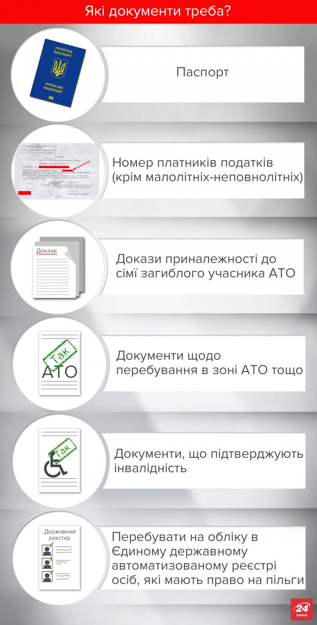 Паспорт, номер налогоплательщиков (кроме малолетних-несовершеннолетних), доказательства принадлежности к семье погибшего участника АТО, документы о пребывании в зоне АТО и тому подобное, документы подтверждающие инвалидность.
