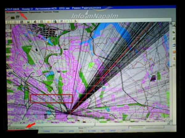 Январь 2014, Донецкая область. Экран рабочего терминала станции постановки радиопомех Р-330Ж "Житель" из состава 18-й отдельной стрелковой бригады ВС РФ (базируется в Чечне). Видно, что станция расположена на территории пожарной части №28 г. Горловка, основную радиоразведку ведет в направлении поселка Луганское, где тогда располагались базовые лагеря нескольких частей ВСУ. Снято на смартфон российским оператором РЭБ, хакнутых украинскими хакерами из группы "Тринити". Источник: Информ Напалм