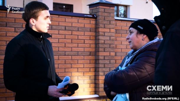 Журналіст програми «Схеми» Михайло Ткач спілкується з Іриною Бурлакою, рідною сестрою дружини Гройсмана