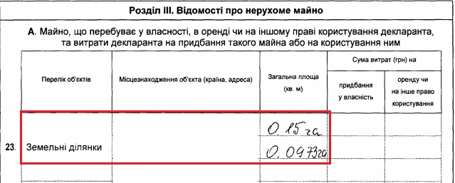 Так само в майновому реєстрі відсутні дані щодо задекларованих Іриною Волоско земельних ділянок площею 15 та 9 соток, а також  земельна ділянка площею 10 соток, які Ірина Романівна декларує як майно родини.
