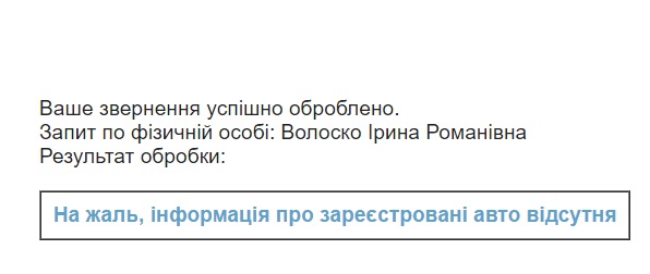 Проте, інформація в єдиному державному реєстрі МВС стосовно зареєстрованих на фізичну особу Волоско Ірину Романівну відсутня.