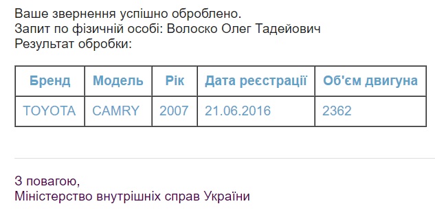 А от на чоловіка пані Ірини, Волоско Олега Тадейовича, дійсно зареєстровано автомобіль Toyota Camry, от тільки реєстрацію цей автомобіль, за даними витягу, пройшов лише у червні 2016р.