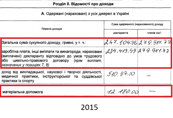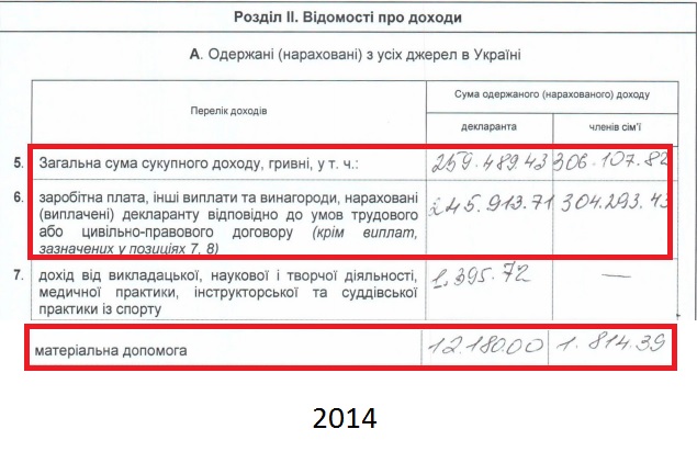 Аналізуючи декларації пані Волоско за 20132014 та 2015 роки, ми бачимо, що основним доходом пані Волоско та її родини за цей час була заробітна плата, при цьому практично кожного року Ірина Романівна та члени її родини отримували і матеріальну допомогу.