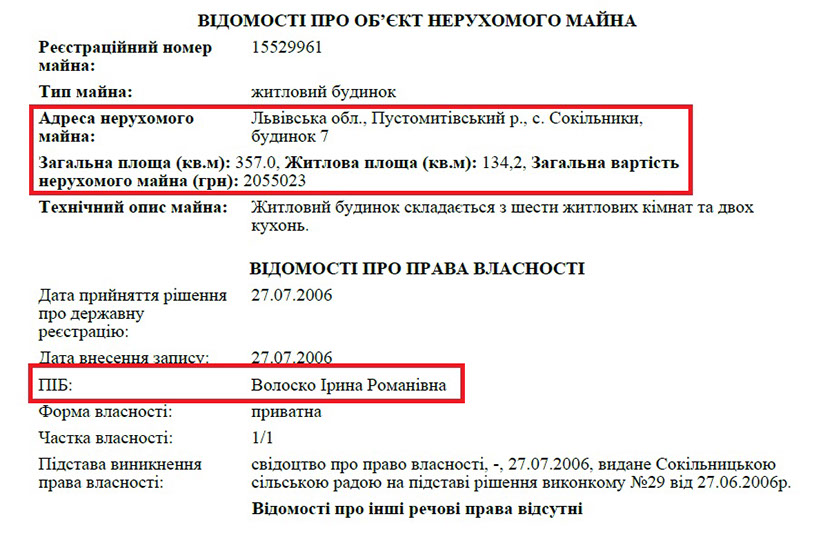 Ця інформація підтверджується як декларацією пані Волоско, так і державним реєстром майнових прав.