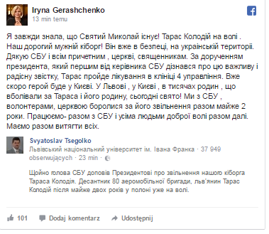 З полону проросійських бойовиків вдалось звільнили українського військового Тараса Колодія. Про це у своєму Facebook повідомив президент Петро Порошенко.