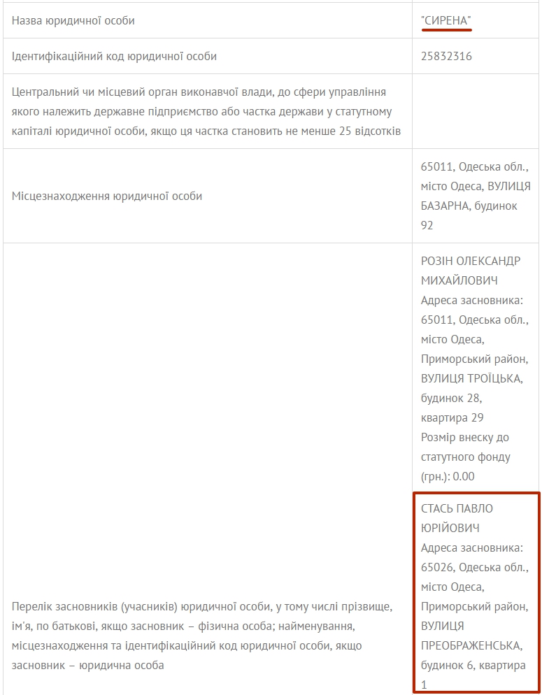 Переконатися, що депутат Стась є родичем засновника «Сирени», нескладно, якщо порівняти адресу, за якою вони зареєстровані.