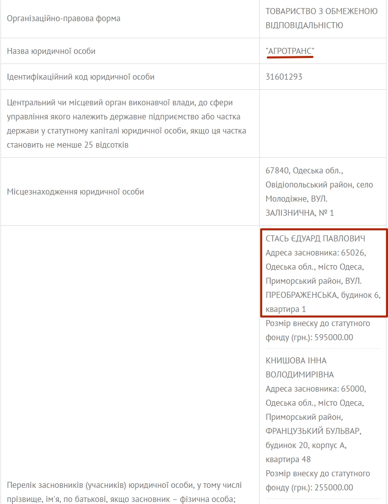 Для порівняння адреси ми взяли виписку з реєстру по підприємству “АГРОТРАНС”, яке задеклароване в декларації депутата Стася за 2014 рік.