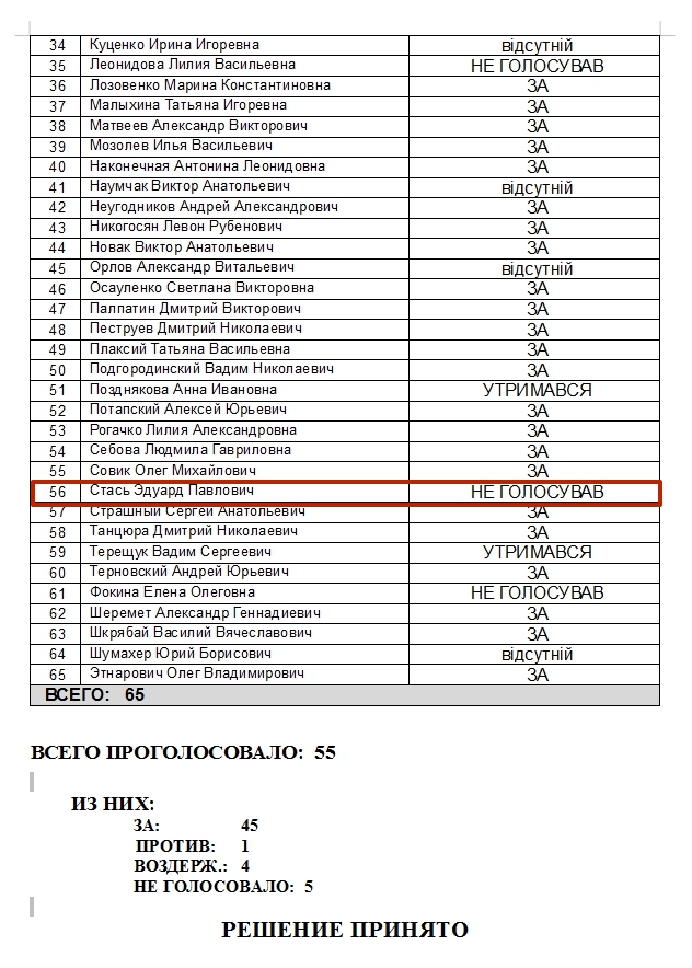Обидві особи зареєстровані за адресою вул. Преображенська, будинок 6, кв. 1. Тобто, на останній сесії у депутата Солідарності Едуарда Стася був приватний інтерес у тому, щоб проект рішення 8.4 був ухвалений. Можливо, тому колеги по БПП проявили до депутата солідарність і проголосували за це рішення.