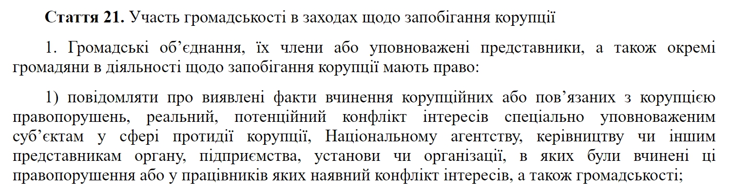Якщо у когось із тих, до кого ви звертаєтесь, виникне питання “яке вам діло до конфлікту інтересів”, то можете послатися на відповідну статтю закону «Про запобігання корупції»