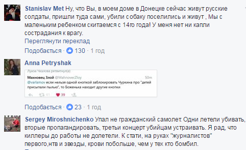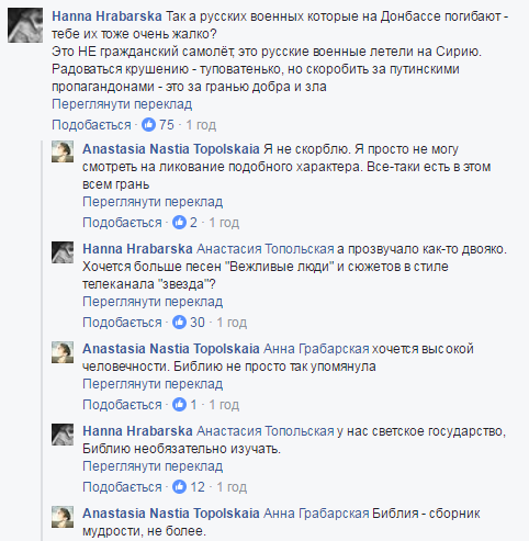 Пользователи социальной сети бурно отреагировали на пост Топольской, напомнив ей о российских военных, которые убивают людей на Донбассе и в Сирии. Кроме того, в очередной раз подчеркнули, что в Черном море потерпел крушение не гражданский самолет, а погибли те, кто "летел убивать, пропагандировать и давать концерты".