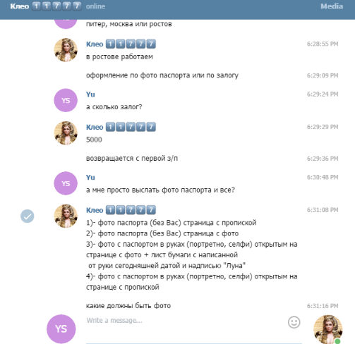 Мы выбрали Ростов. Для оформления необходимо скинуть фото паспорта и фото с паспортом. Эти фотографии потом используются в качестве шантажа. Если сотрудник отказывается выполнять работу, ему угрожают сдачей в милицию.
