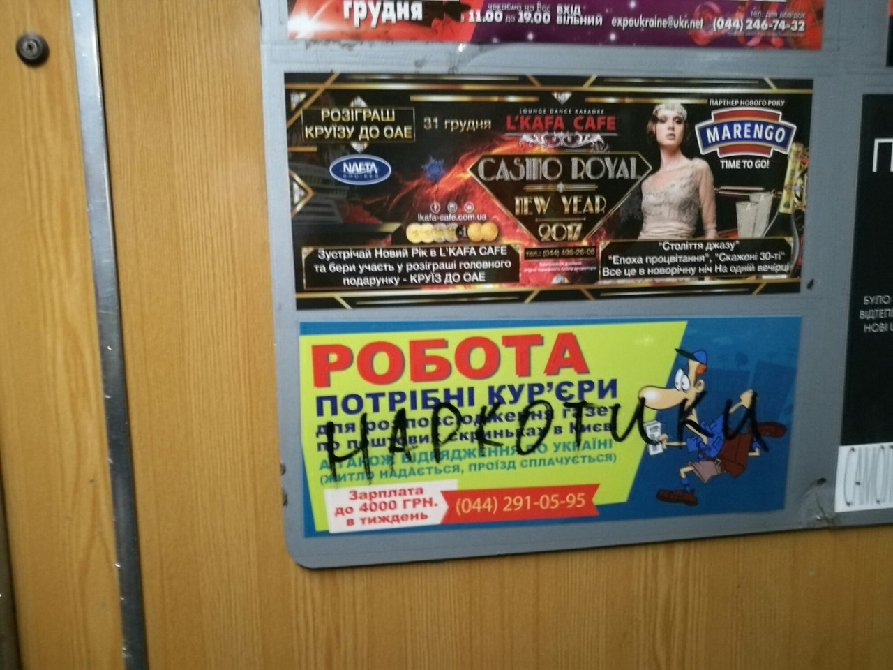 Листовки о работе наркокурьером долгое время висели в киевском метро. Потом, когда поднялся скандал, их начали убирать.